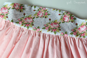 Now, pin the gathered skirt to the bodice.  The more pins that you use, the more even your gathers will stay when you sew the pieces together.  Add more steam as needed to make sure that all the gathers are lined up nicely.  Then, you're ready to stitch the bodice to the skirt.  Line up your needle so that you can stitch directly in the center of your two rows of gathering stitches.  You'll see how the two rows of stitches hold everything in place.  Go slow and make sure that your gathers stay even and then your raw edges stay aligned.
